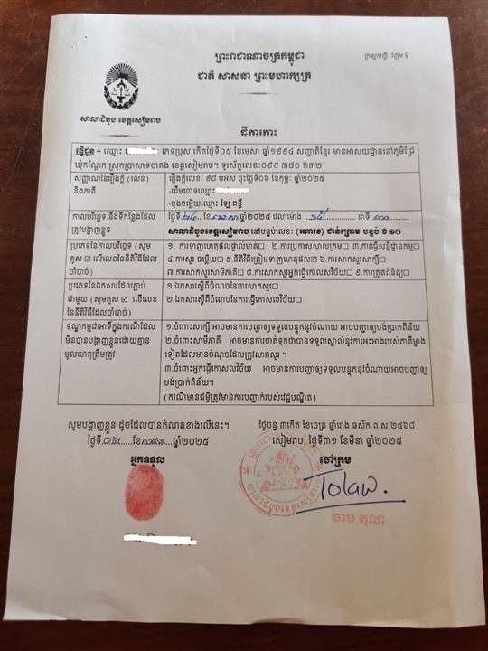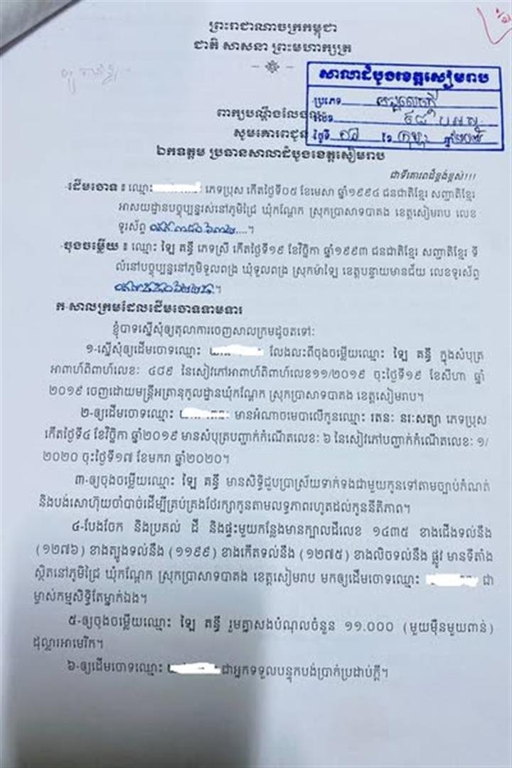ហើយកាលដែលចូលក្នុងផ្ទះរបស់ខ្ញុំ កូនប្រសារខ្ញុំបាននំាមិត្តភ័ក្ត្រដល់ទៅ៥នាក់ចូលមកផ្ទះខ្ញុំ ដោយពុំមានការអនុញ្ញាតិពីក្រុមគ្រួសាររបស់ខ្ញុំផង ដោយម្នាក់ជាកូនប្រសារខ្ញុំយំសម្តែង ដើម្បីអោយមិត្តភ័ក្ត្ររបស់គេថតក្នុងចេតនាថតបង្ហោះបង្ខូចកេរ្តិ៍ឈ្មោះខ្ញុំ និងគ្រួសារ ចឹងខ្ញុំមានសិទ្ធប្តឹងបាន។