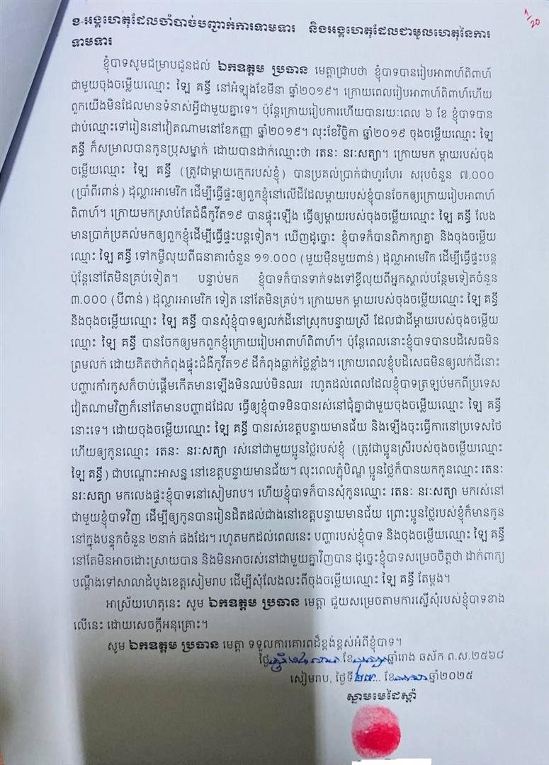 អ្វីដែលហួសចិត្តនោះ គឺកូនប្រសារស្រីខ្ញុំហ៊ានធ្វើទំាងបំពាន ដោយនំាគ្នាមកអុកឡុកផ្ទះរបស់ខ្ញុំហើយថតបង្ហោះលើបណ្តាយសង្គម ធ្វើឲ្យគេស្អប់ខ្ពើមពួកខ្ញុំមួយគ្រួសារ។ ផ្ទះដែលថតបង្ហោះនោះគឺជាផ្ទះរបស់ខ្ញុំ មិនមែនផ្ទះរបស់កូនខ្ញុំ និងកូនប្រសារនោះទេ។ ផ្ទះរបស់ពួកគេមានមួយផ្សេងទៀតដែលកំពុងសាងសង់មិនទាន់ហើយ។ បើសិនខ្ញុំស្អប់ខ្ពើមកូនប្រសារមែន ខ្ញុំមិនចំាបាច់អោយចូលដល់ក្នុងផ្ទះរបស់ខ្ញុំបាននោះទេ។