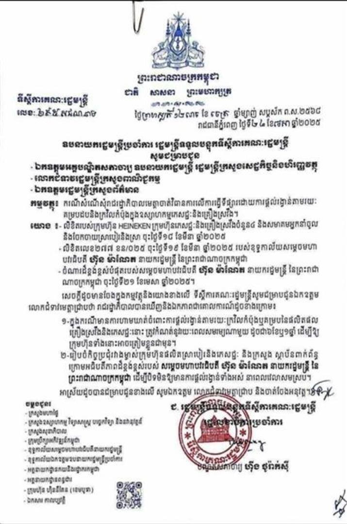 កាលពីថ្ងៃទី២៤ ខែមេសា ឆ្នាំ២០២៥កន្លងទៅនេះ ទីស្តីការគណៈរដ្ឋមន្ត្រី បានផ្ញើលិខិតមួយទៅកាន់លោកអគ្គបណ្ឌិតសភាចារ្យ អូនព័ន្ធ មុនីរ័ត្ន ឧបនាយករដ្ឋមន្ត្រី រដ្ឋមន្ត្រីក្រសួងសេដ្ឋកិច្ច និងហិរញ្ញវត្ថុ, លោកស្រី ចម និម្មល រដ្ឋមន្ត្រីក្រសួងពាណិជ្ជកម្ម និងលោក នេត្រ ភក្ត្រា រដ្ឋមន្ត្រីក្រសួងព័ត៌មាន