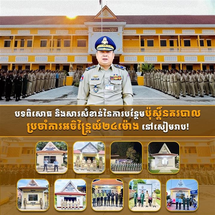 សៀមរាប៖ បន្ថែមលើប៉ុស្តិ៍នគរបាលរដ្ឋបាលឃុំ សង្កាត់ ចំនួន១០០ ប៉ុស្តិ៍នគរបាលចរាចរណ៍ផ្លូវគោក និងប៉ុស្តិ៍នគរបាលការពារបេតិកភណ្ឌមួយចំនួនទៀត លោកឧត្តមសេនីយ៍ទោ ហួត សុធី ស្នងការ នៃស្នងការដ្ឋាននគរបាលខេត្តសៀមរាប បានទទួលការឯកភាពពីអគ្គស្នងការនគរបាលជាតិ រៀបចំប៉ុស្តិ៍នគរបាលប្រចាំការអចិន្ត្រៃយ៍២៤ម៉ោង។ ប៉ុស្តិ៍នគរបាលប្រចាំការអចិន្ត្រៃយ៍២៤ម៉ោង ត្រូវបានកំណត់ដាក់បន្ថែមនៅតាមគោលដៅ និងភូមិសាស្រ្តមានហានិភ័យ ដើម្បីបម្រើបេសកកម្មធានាសន្តិសុខ និងសុវត្ថិភាពជូនភ្ញៀវទេសចរជាតិ និងអន្តរជាតិ ព្រមទាំងប្រជាពលរដ្ឋទូទៅ។