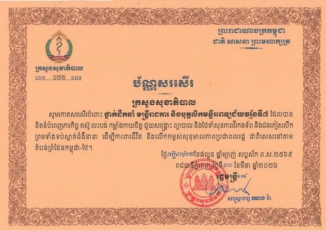 ក្នុងឱកាសដ៏មានអត្ថន័យនេះ ថ្នាក់ដឹកនាំ និងបុគ្គលិកទាំងអស់នៃមន្ទីរពេទ្យជ័យវរ្ម័នទី៧ បានសម្តែងនូវការគោរពថ្លែងអំណរគុណយ៉ាងជ្រាលជ្រៅ ចំពោះឯកឧត្តមរដ្ឋមន្ត្រី ដែលបានយកចិត្តទុកដាក់ លើកទឹកចិត្ត និងផ្តល់កិត្តិយសជាប័ណ្ណសរសើរ ដែលជាកម្លាំងចិត្តដ៏មានតម្លៃសម្រាប់បន្តបេសកកម្មសុខាភិបាល។