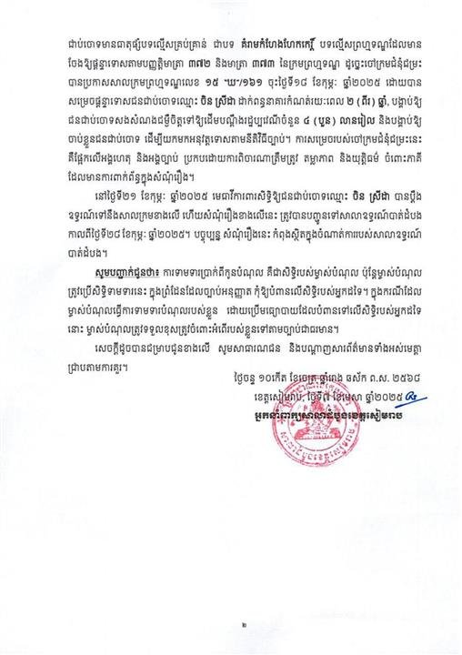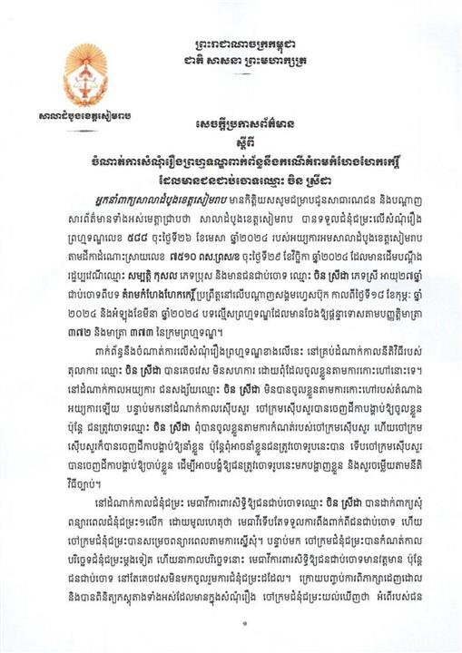 សៀមរាប៖ អ្នកនាំពាក្យសាលាដំបូងខេត្តសៀមរាប មានកិត្តិយសសូមជម្រាបជូនសាធារណជន និងបណ្តាញ សារព័ត៌មានទាំងអស់មេត្តាជ្រាបថា សាលាដំបូងខេត្តសៀមរាប បានទទួលជំនុំជម្រះលើសំណុំរឿង ព្រហ្មទណ្ឌលេខ ៥៨៨ ចុះថ្ងៃទី២៦ ខែមេសា ឆ្នាំ២០២៤ របស់អយ្យការអមសាលាដំបូងខេត្តសៀមរាប តាមដីកាដំណោះស្រាយលេខ ៧៥១០ ពស.ពស/ខ ចុះថ្ងៃទី២៩ ខែវិច្ឆិកា ឆ្នាំ២០២៤ ដែលមានដើមបណ្តឹង រដ្ឋប្បវេណីឈ្មោះ សម្បត្តិ កុសល ភេទប្រុស និងមានជនជាប់ចោទ ឈ្មោះ ចិន ស្រីដា ភេទស្រី អាយុ២៧ឆ្នាំ ជាប់ចោទពីបទ គំរាមកំហែងហែកកេរ្ដិ៍ប្រព្រឹត្តនៅលើបណ្ដាញសង្គមហ្វេសប៊ុក កាលពីថ្ងៃទី១៨ ខែកុម្ភៈ ឆ្នាំ ២០២៤ និងអំឡុងខែមីនា ឆ្នាំ២០២៤ បទល្មើសព្រហ្មទណ្ឌដែលមានចែងឱ្យផ្ដន្ទាទោសតាមបញ្ញត្តិមាត ៣៧២ និងមាត្រា ៣៧៣ នៃក្រមព្រហ្មទណ្ឌ។