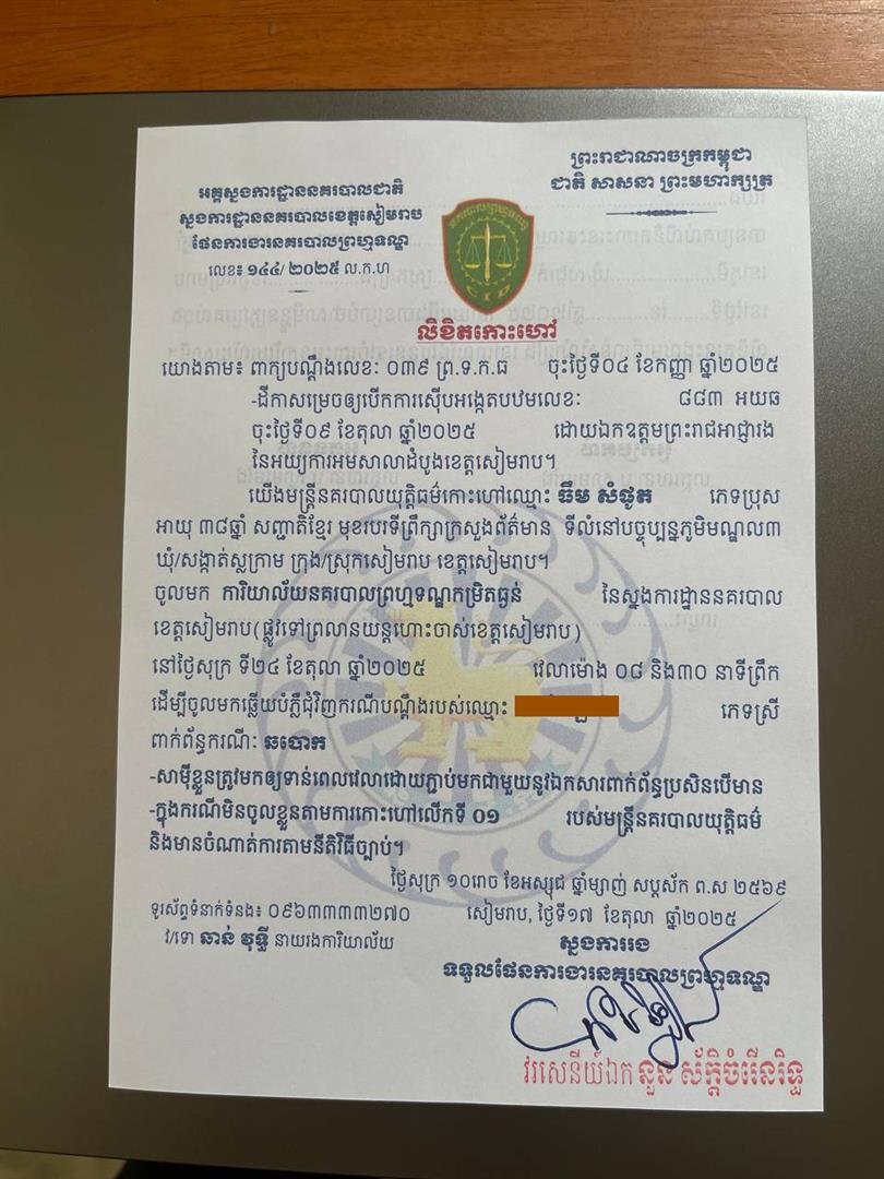 ១- បុគ្គលឈ្មោះ ធឹម សំផូត ធ្លាប់ជាទណ្ឌិត (ជាប់ទោសដោយបទល្មើសឆបោក) កាលពីកំឡុងឆ្នំា២០១២។ ប៉ុន្តែក្រោយពីពេញពីគុកមកវិញ បុគ្គលរូបនេះមិនបានកែប្រែខ្លួននោះទេ គឺនៅប្រព្រឹត្តិបទល្មើសដដែល។ ដោយនៅក្នុងខែតុលា ឆ្នំា២០២៥ នេះ បុគ្គលឈ្មោះ ធឹម សំផូត ត្រូវបានឯកឧត្តមព្រះរាជអាជ្ញារង នៃអយ្យការអមតុលាការខេត្តសៀមរាបចេញដីកាសម្រេចឲ្យបើកការស៊ើបអង្កេតលើករណីឆបោក និងត្រូវបាននគរបាលយុត្តិធម៌ នៃស្នងការដ្ឋាននគរបាលខេត្តសៀមរាបចេញលិខិតកោះហៅឱ្យចូលខ្លួនកាលពីថ្ងៃទី២៤ ខែតុលាឆ្នំា២០២៥ វេលាម៉ោង០៨ និង៣០ នាទីព្រឹក ដោយយោងទៅតាមពាក្យបណ្តឹងរបស់ស្ត្រីម្នាក់ ដោយមានលិខិតលេខ៖ ១៤៤/២០២៥ ល.ក.ហ ។