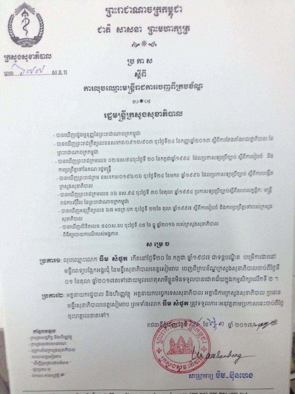 ២-បុគ្គលឈ្មោះ ធឹម សំផុត ត្រូវបានក្រសួងសុខាភិបាល ចេញប្រកាសលុបឈ្មោះមន្ត្រីរាជាការចេញពីក្របខ័ណ្ឌ តាមរយៈប្រកាសលេខ ៦៧៧ ស.ន.ប ចុះថ្ងៃទី២៩ ខែវិច្ឆកា ឆ្នំា២០១៧ ។ ហើយអ្វីដែលយើងកាន់ចម្លែកទៀតនោះ គឺ បុគ្គលឈ្មោះ ធឹម សំផូតនេះមានសញ្ញាបត្រ ទន្តបណ្ឌិត ជំនាញទន្តសាស្ត្រដល់ទៅពីរ ម្នាក់ឯង និងមានថ្ងៃខែឆ្នំាកំណើតខុសគ្នាផងដែរ។ គឺទីមួយសន្លឹកវិញ្ញាបនបត្របញ្ជាក់ការសិក្សាបានប្រលងបញ្ជាប់ការសិក្សាកំរិត ទន្តបណ្ឌិត ជំនាញ ទន្តសាស្ត្រ លេខៈ T0628 ស.អ ចេញដោយដោយសាកលវិទ្យាល័យ អន្តរជាតិ ចុះថ្ងៃទីទី២៣ ខែឆ្នូ ឆ្នំា២០០៩ គឺមានថ្ងៃខែឆ្នំាកំណើត កើតថ្ងៃទី២០ ខែកក្កដា ឆ្នំា១៩៨២។ ចំណែកឯសញ្ញាបត្រទន្តបណ្ឌិត នេះដដែល ដែលចេញដោយ សាកលវិទ្យាល័យ អន្តរជាតិ លេខៈD5121 ស.អ ចុះថ្ងៃទី២២ ខែកក្កដា ឆ្នំា២០១៣ គឺមានថ្ងៃខែឆ្នំាកំណើត កើតថ្ងៃទី២០ ខែកក្កដា ឆ្នំា១៩៨៧។